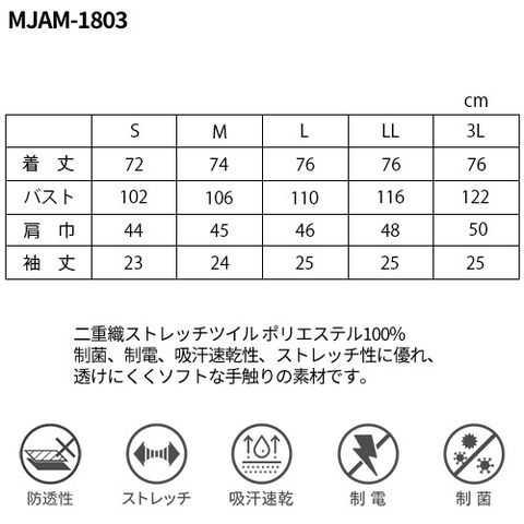 | SEK制菌、制電、吸汗速乾、ストレッチ、防透 |