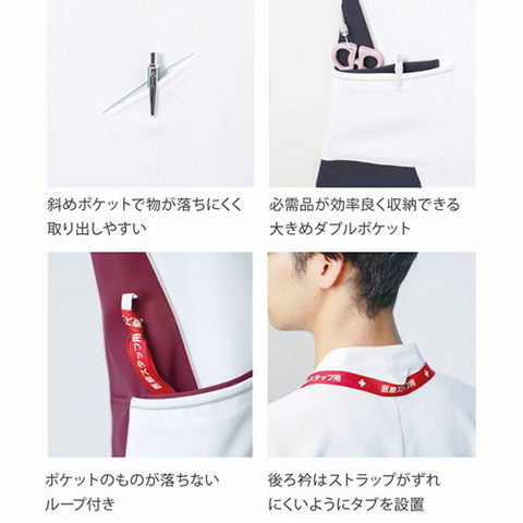 | 浅めのVネック かがんでもチラ見えしにくいデザイン 首元の安心設計 着脱スムーズなスナップボタンとロック可能なファスナー付き 衿後ろにタブ付き ストラップがずれにくく直接肌に触れず快適 PHS用ポケット 後ろ切替部分にPHSが入るポケット付き スラッシュポケット PHSが出し入れしやすい仕様で、物が落ちにくい位置と形に設定 二重構造ポケット 小物を分別しやすい二重構造 高めのファスナー止まり 座る・かがむ動作の窮屈さを軽減します |