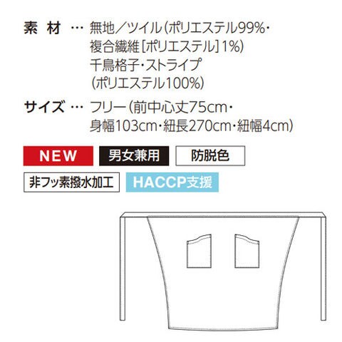| 防脱色(塩素系漂白剤が付着しても変色しにくい加工),非フッ素撥水加工,HACCP支援 |