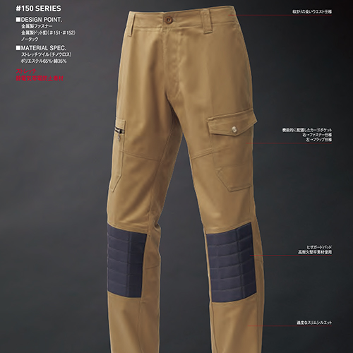 収まりの良いウエスト仕様、機能的に配置したカーゴポケット(右・ファスナー仕様、左・フラップ仕様)、ヒザガードパッド高耐久堅牢素材使用、適度なスリムシルエット
