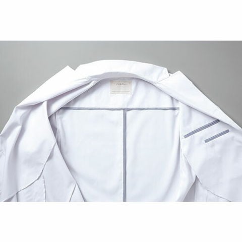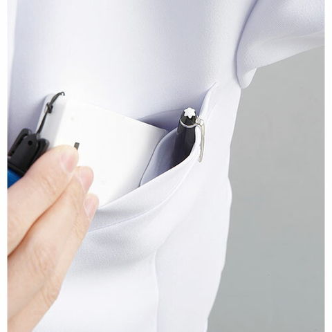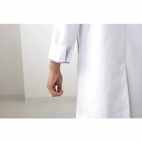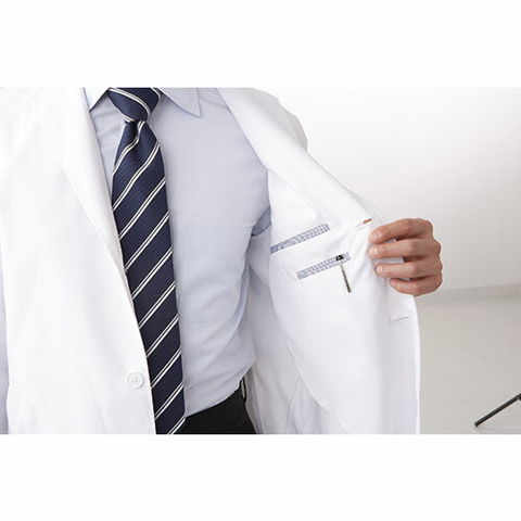| スリムなシルエットでさりげない動きも様になる、素材にもこだわったデザイナーズ・ドクターコート。PHSなど区分けしてすっきり収納できる二重構造のポケットや、便利な内ポケットはロンドンストライプとパイピングがオシャレ。コートに使っている素材は、高密度に織り込むことにより横方向にナチュラルなストレッチがあり、固くならない適度なハリコシに仕上げ、しなやかさを感じる制電性能付き素材。スクラブ・パンツとコーディネートしてスマートな印象になる長袖のメンズシングルコートです。 |