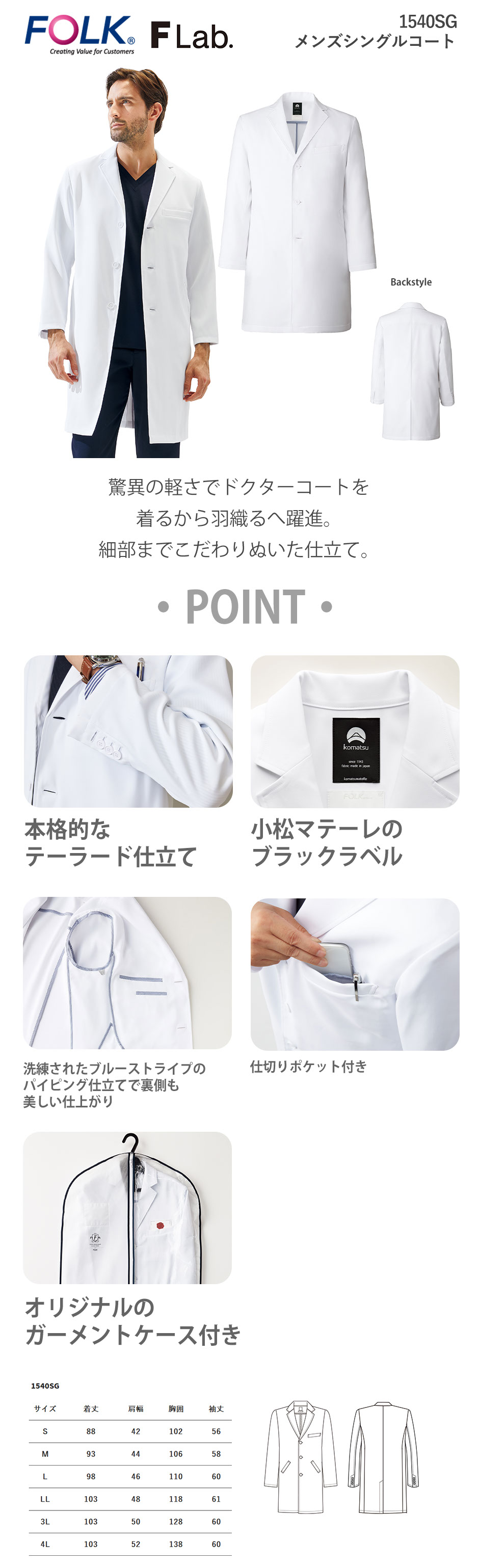 ドクターコート 白衣 1540SG Flab. メンズシングルコート FOLK フォーク メンズ 男性用 長袖 ロング丈 医者 病院 看護師 薬剤師 エステ 薬局 医療用 制服 ユニフォーム 軽量 高級 襟 名入れ おしゃれ かっこいい 動きやすい おすすめ