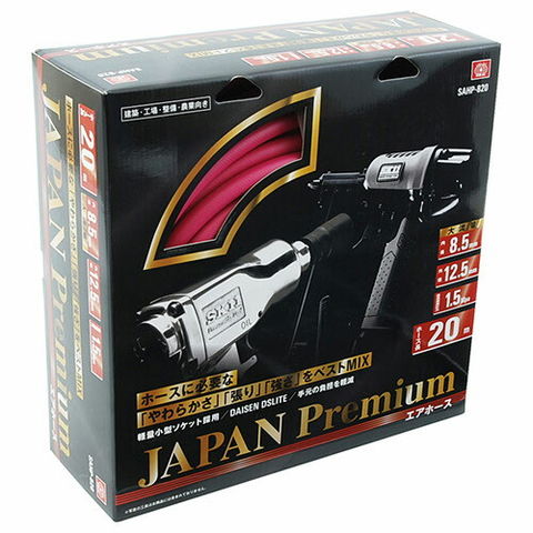 | ●サイズ:内径8.5mm×外径12.5mm。 ●ホース長:20m。 ●最高使用圧力:1.5Mpa。 ●使用流体:圧縮空気。 ●接続形状:汎用ソケット・プラグ。 |