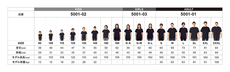 500101のガールズサイズモデル。細めの首リブやゆとりのある首もと、短めの袖丈・身丈といった女性専用のサイジングに、Style No.5001-01本来のボックスシルエットが掛け合わさったオールマイティTシャツ。メンズライクなスタイリングにぴったりです。