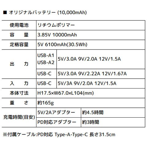 | オリジナルバッテリー(10,000mAh) 使用電池:リチウムポリマー 容量:3.85V 10000mAh 定格容量:5V 6100mAh(30.5Wh) 出力:5V/3A 9V/2.0A 12V/1.5A(USB-Aの場合) 5V/3A 9V/2.22A 12V/1.67A(USB-Cの場合) 入力:5V/3A 9V/2.22A 12V/1.67A(USB-Cの場合) 本体寸法:H17.5×W67×L104(mm) 重さ:約165g 充電時間:約5時間(通常アダプター5Vの場合) 約3時間(PD対応アダプターの場合) ※バッテリー充電器は付属しません ※付属ケーブル:PD対応 Type-A-Type-C 長さ31.5cm |