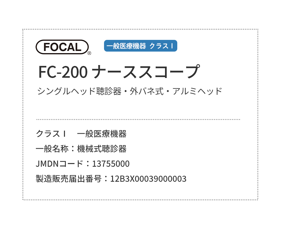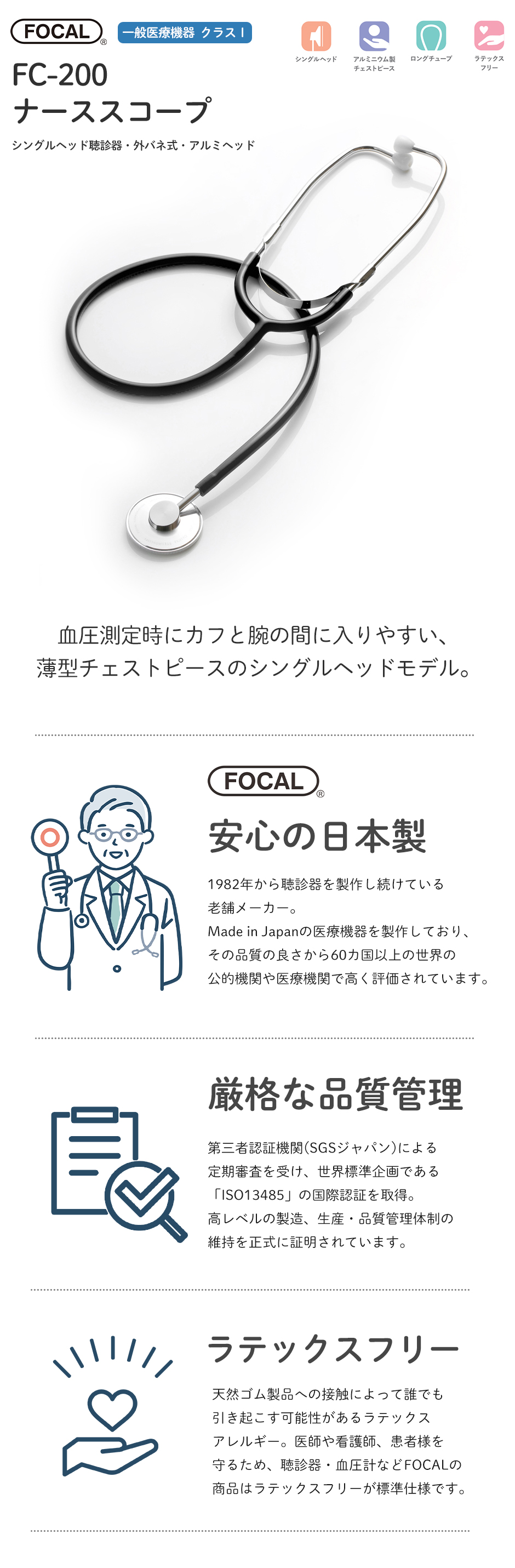 [日本製] FOCAL フォーカル 聴診器 ナーススコープ FC-200 シングルタイプ 内バネ式 一般医療機器 医療用 病院 クリニック 看護師 ナース 看護学生 医師 ドクター 研修医 診察 医療 国内正規品