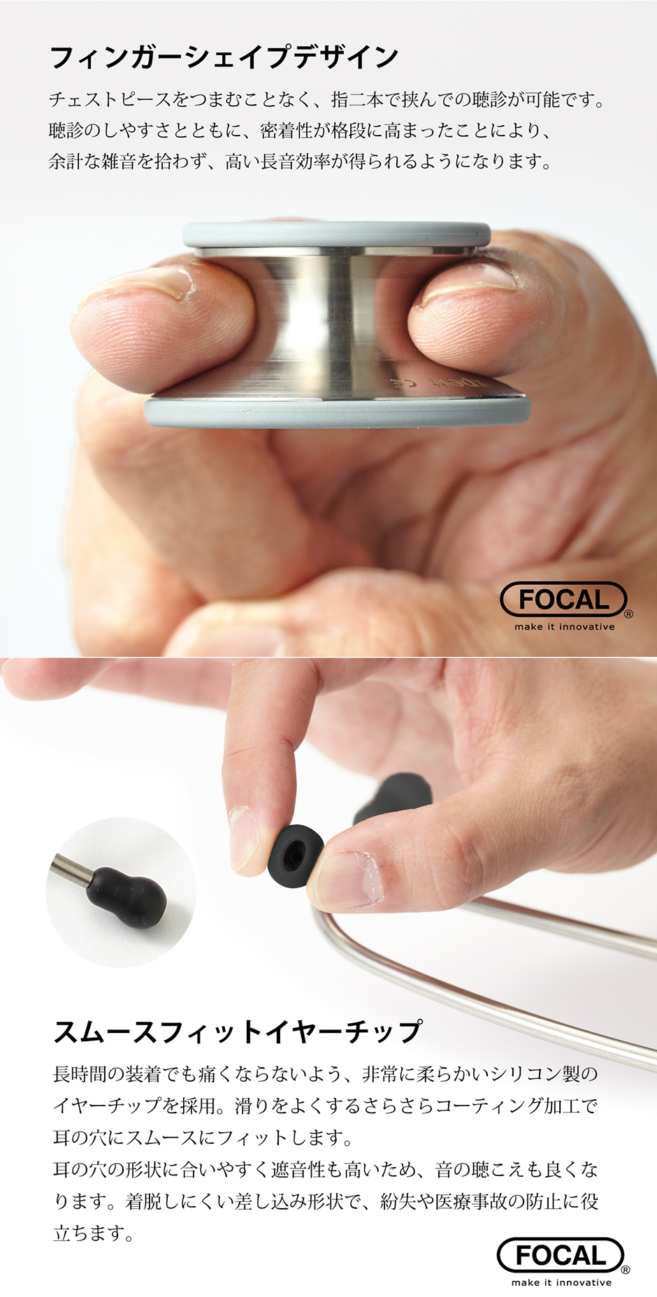 チェストピースをつまむことなく、指二本で挟んでの聴診が可能。聴診のしやすさとともに密着性が格段に高まったことにより、余計な雑音を拾わず、より高い聴音効率を発揮。