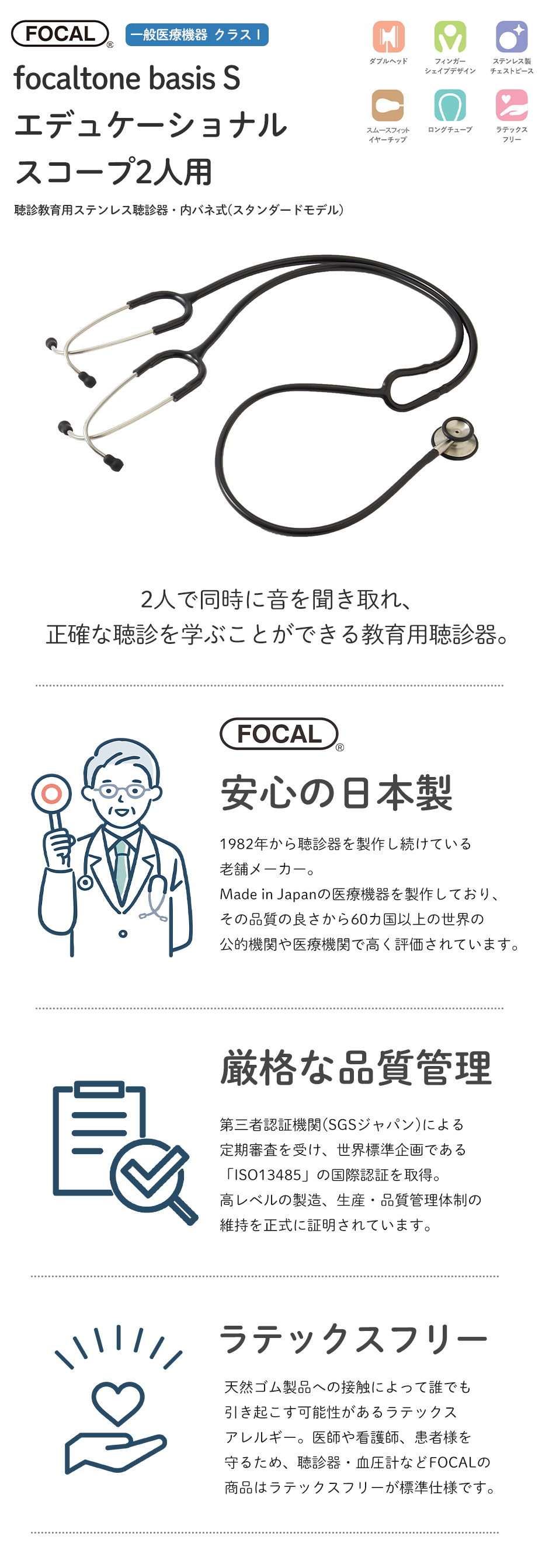 [日本製] FOCAL フォーカル 聴診器 教育用 フォーカルトーン focaltone basis S エデュケーショナルスコープ 2人用 ダブルタイプ 内バネ式 オールステンレス 一般医療機器 医療用 病院 クリニック 医療 看護学生 医師 ドクター 研修医 診察 国内正規品