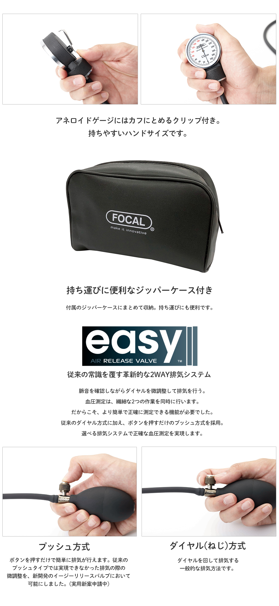 | 自己測定に便利な聴診器一体型モデル2つの選べる排気システムで、より正確な血圧測定を実現。 脈音を確認しながらダイヤルを微調整して排気を行う。血圧測定は、繊細な2つの作業を同時に行います。 だからこそ、より簡単で正確に測定できる機能が必要でした。従来のダイヤル方式に加え、ボタンを押すだけのプッシュ方式を採用。選べる排気システムで正確な血圧測定を実現します。 ■50万回の耐久性試験をクリア 計量法の規格要求加減圧耐久性3万回に対し、16倍の50万回の耐久性試験をクリアしました。※血圧計本体の検査体制 ■エクストラロングチューブを標準装備 医療現場の要望を元に考案したフォーカルオリジナルの70cmエクストラロングチューブ。患者様との適切な距離が取りやすく、測定操作の向上に貢献します。 ■安心のラテックスフリー仕様 ラテックスによる医療従事者・患者様のアレルギー羅患リスクを回避するため、ゴム素材は安心のオールラテックスフリーを標準仕様にしています。 ■持ち運びに便利なジッパーケース付き 付属のジッパーケースにまとめて収納。持ち運びにも便利です。 ■イージーリリースバルブ(ERV)を標準装備 従来のダイヤルを回して排気する方式に加え、ボタンを押すだけで排気が行えるプッシュ方式を採用。排気時の微調整を、ボタンを押す・離すのみの簡単操作で可能にしました。これから血圧測定技術を習得する看護学生様には特に最適な仕様です。 |