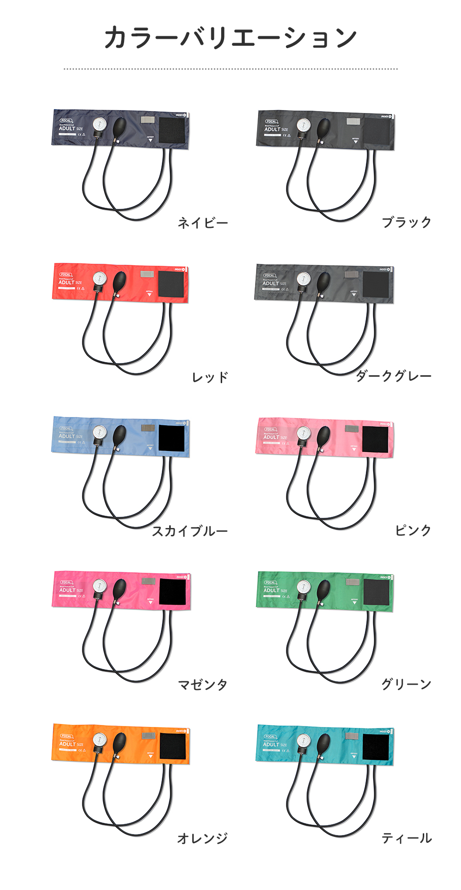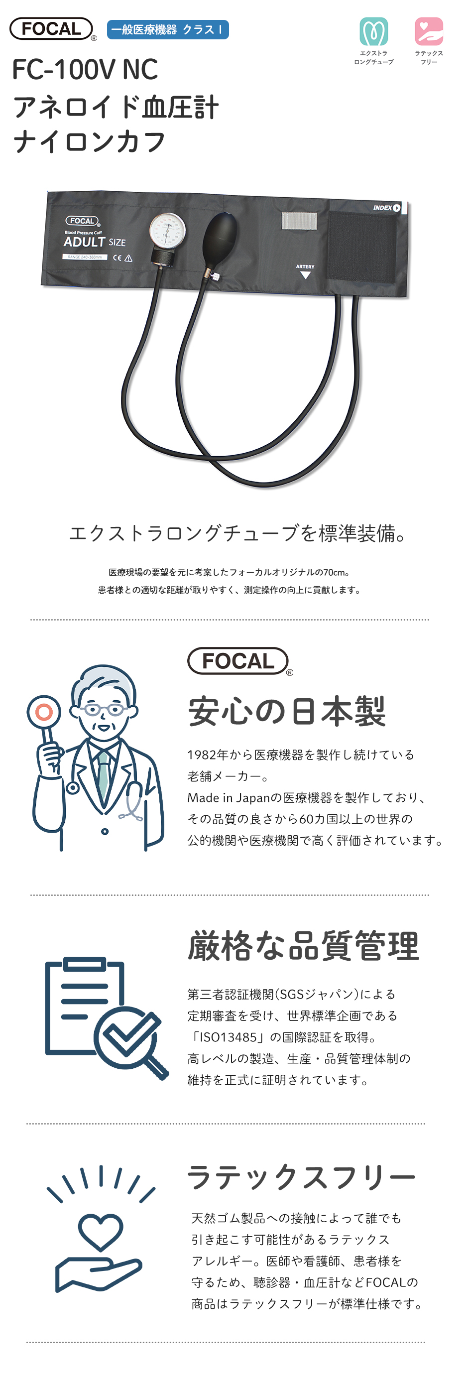 医療現場の要望を元に考案したフォーカルオリジナルの70cmエクストラロングチューブ。患者様との適切な距離が取りやすく、測定操作の向上に貢献します。