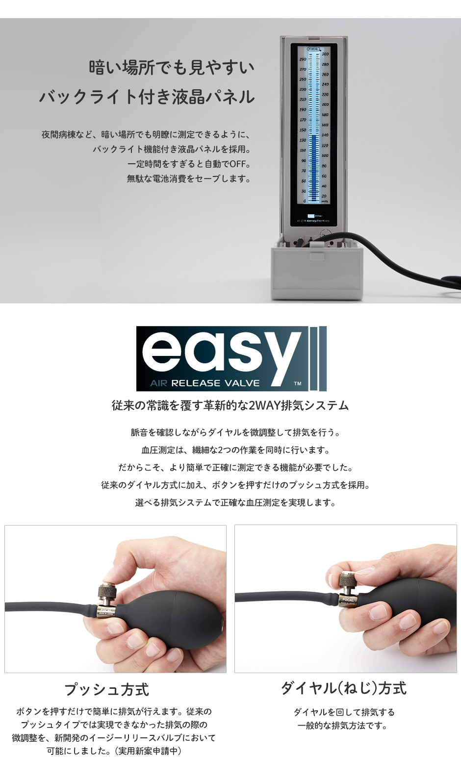 | 従来と同じ測定方法で、より高精度に。血圧測定の現場に使いやすさと安心を。WHOが推奨する聴診法での血圧測定を、従来と変わらない簡単操作でできないか。医療現場の声をもとに、血圧測定時の使いやすさはもちろん、環境にも優しい血圧計が生まれました。従来と変わらない慣れた操作方法で、より正確な血圧測定を実現します。 2つの選べる排気システムで、より正確な血圧測定を実現。 脈音を確認しながらダイヤルを微調整して排気を行う。血圧測定は、繊細な2つの作業を同時に行います。 だからこそ、より簡単で正確に測定できる機能が必要でした。従来のダイヤル方式に加え、ボタンを押すだけのプッシュ方式を採用。選べる排気システムで正確な血圧測定を実現します。 ■見やすいバックライト付き液晶パネル 夜間病棟など、暗い場所でも明瞭に測定できるように、バックライト機能付き液晶パネルを採用。一定時間をすぎると自動でOFF。無駄な電池消費をセーブします。 ■エクストラロングチューブを標準装備 医療現場の要望を元に考案したフォーカルオリジナルの70cmエクストラロングチューブ。患者様との適切な距離が取りやすく、測定操作の向上に貢献します。 ■安心のラテックスフリー仕様 ラテックスによる医療従事者・患者様のアレルギー羅患リスクを回避するため、ゴム素材は安心のオールラテックスフリーを標準仕様にしています。 ■イージーリリースバルブ(ERV)を標準装備 従来のダイヤルを回して排気する方式に加え、ボタンを押すだけで排気が行えるプッシュ方式を採用。排気時の微調整を、ボタンを押す・離すのみの簡単操作で可能にしました。これから血圧測定技術を習得する看護学生様には特に最適な仕様です。 |