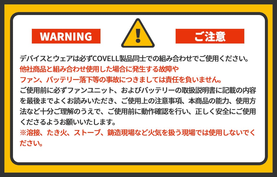 | ・炎天下の車内などの熱い場所(60℃以上)で使用、充電、放置はしないでください。 ・バッテリーは指定の機器のみで使用、充電してください。 ・充電可能温度(0~40℃)の範囲外で充電しないでください。性能、寿命を低下させることがあります。 ■火気を扱う場所での注意事項 ・ファンに火花が入るような状態での作業には使用しないでください。 ・万が一衣服に火が移った場合、衣服を脱ぎ、火を消してください。速やかにバッテリーを取外し火元から遠ざけてください。 ■バッテリー保管の注意事項 ・リチウムイオンバッテリーは、過放電させると著しく寿命を縮めるばかりでなく、化学反応により内部が不安定な状態になります。 ・電池残量がゼロの状態で長期保管はしないでください。 ・長期使用しない場合には自然放電により残量が少しずつ減少しますので半年に1回程度、充電して下さい。 ・電池残量ゼロのまま放置すると完全放電し、再充電できなくなりますので十分注意してください。 ■快適ウェア製品のお取扱いについて ・洗濯時は必ずすべての電気部品を取り外し、衣服だけを洗ってください。 ・洗濯表示、注意ラベルに従ってお取扱いください。 |