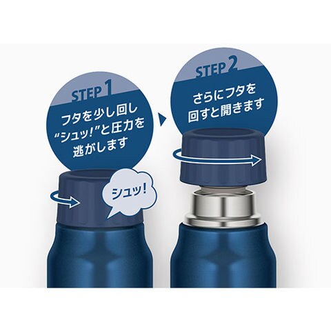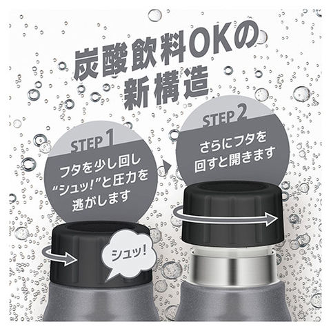 炭酸飲料OK!フタを少し回すと中の圧力が逃げる新構造のフタを採用。真空断熱構造なので、炭酸飲料を冷たいまま持ち運び、最後までおいしく飲むことができます。