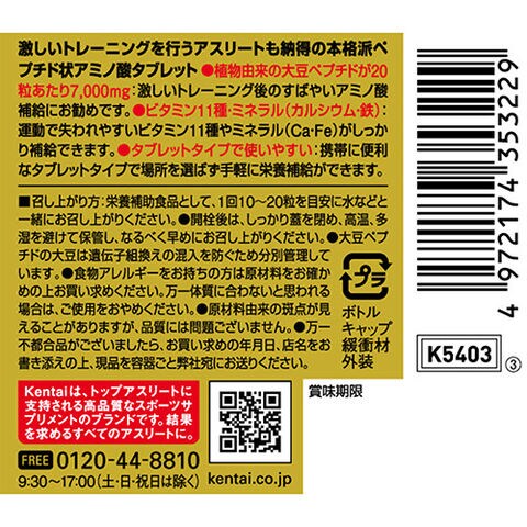 20粒あたり大豆ペプチドを7,000mg配合の本格派アミノ酸タブレット。