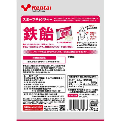 | スポーツキャンディーは、スポーツサプリメントのパイオニアKentaiが提案する新しいスタイルの機能性キャンディーです。スポーツを楽しむすべての人へ。 栄養機能食品。 運動時でも、片手で開けられるイージーオープンパッケージ採用 ビタミンC: Cを1粒に100mgたっぷり配合 レモン味 鉄: 1日に必要な鉄分の1/3量※を配合(3粒摂取で約2.2mg) リンゴ味 ブドウ糖: ブドウ糖1,250mg(3粒摂取) B1(3粒摂取) グレープ味 |