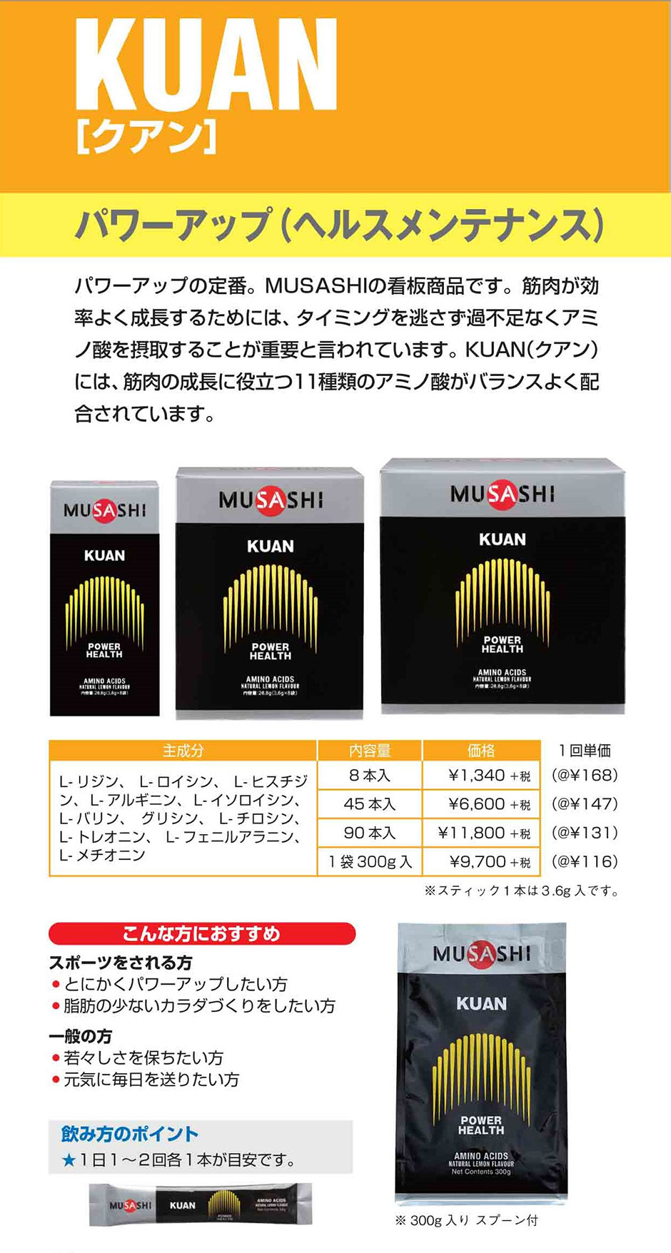 | パワーアップの定番。MUSASHIの看板商品です。筋肉が効率よく成長するためには、タイミングを逃さず過不足なくアミノ酸を摂取することが重要と言われています。 KUAN(クアン)には、筋肉の成長に役立つ11種類のアミノ酸がバランスよく配合されています。 男性用。 内容量:324g(3.6g×90本) 原材料:L-アルギニン・L-イソロイシン・L-ロイシン・L-バリン・L-リジン・L-フェニルアラニン・L-メチオニン・L-チロシン・L-ヒスチジン・L-トレオニン・グリシン |