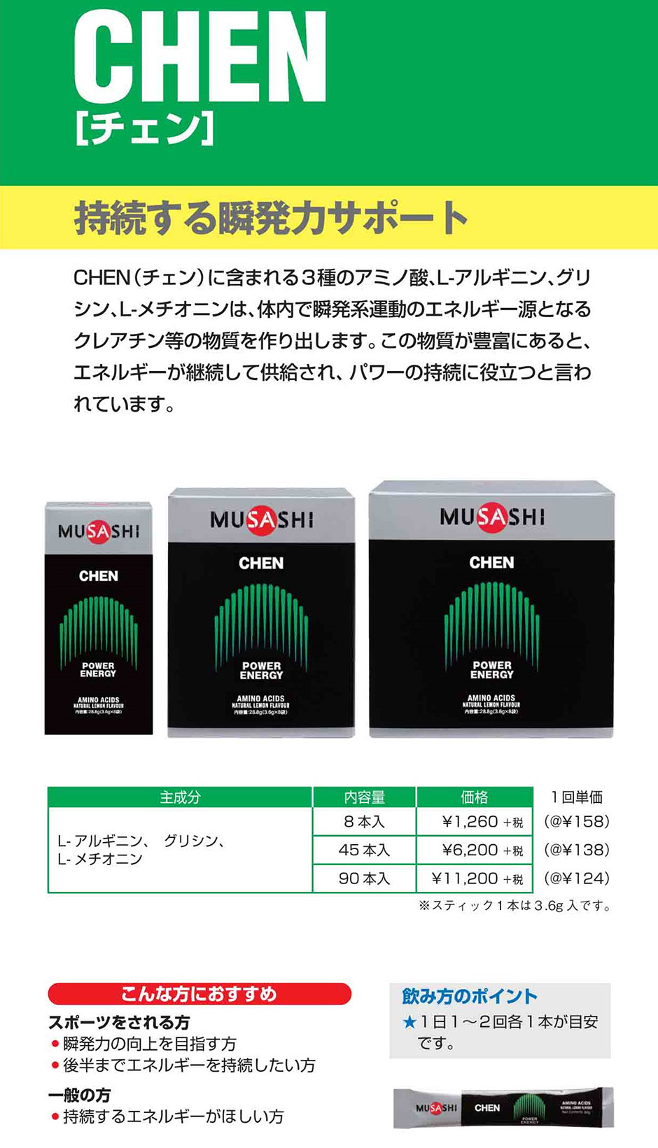 CHEN(チェン)に含まれる3種のアミノ酸、L-アルギニン、グリシン、L-メチオニンは、 体内で瞬発系運動のエネルギー源となるクレアチンという物質を作り出します。 この物質が豊富にあると、エネルギーが継続して供給され、パワーの持続に役立つと言われています。