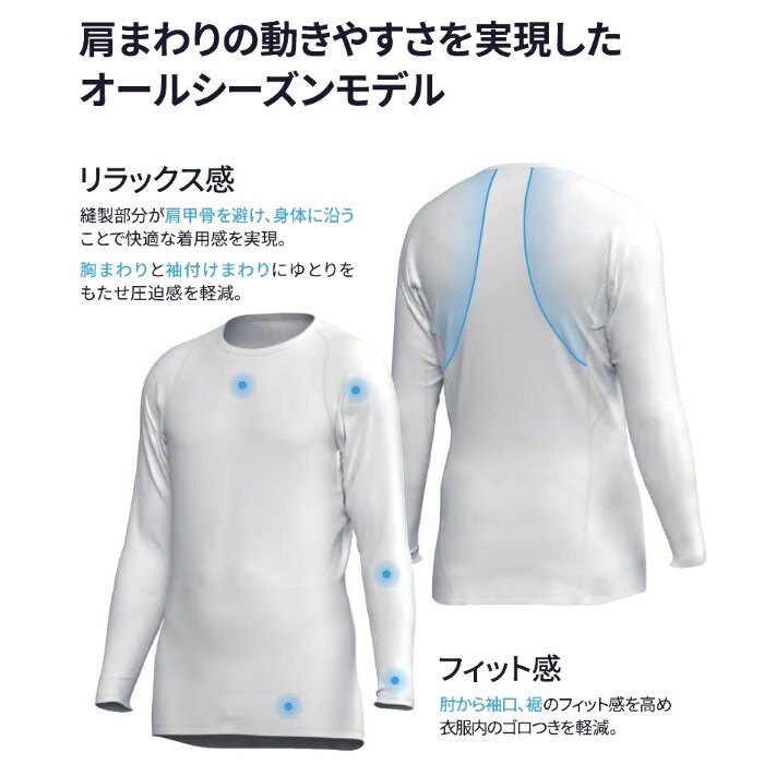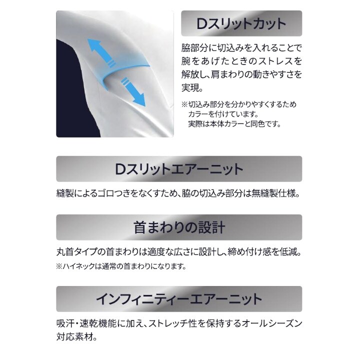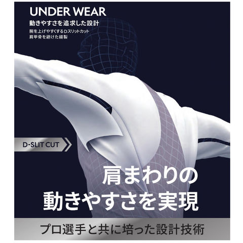 ■商品説明 ストレッチ・吸汗・速乾性を備えた開発素材を採用。脇あけ仕様のDスリットカットが、腕上げ・回旋運動時のストレスを低減。脇部分の生地は無縫製でもほつれない開発素材を採用し、脇部分のゴロつきを低減。また、背中部分は肩甲骨を避ける縫製で肩まわりの動きやすさを実現。