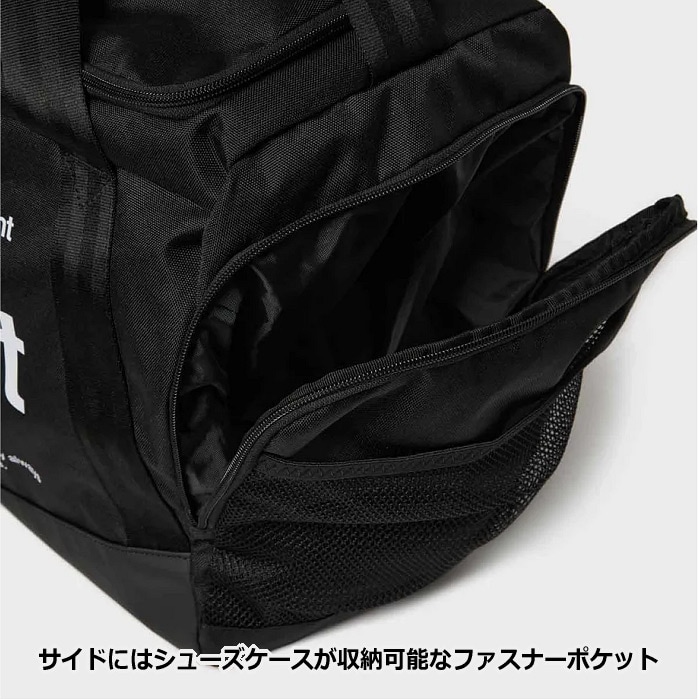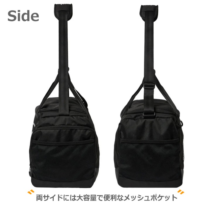サイドにはシューズケースが収納可能なファスナーポケットが、両サイドには大容量で便利なメッシュポケットがあり、充実の収納力です。