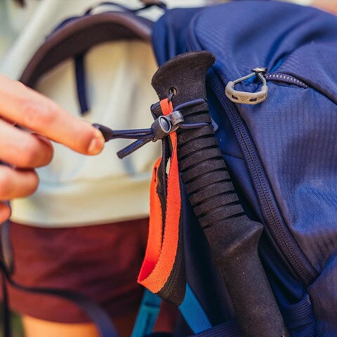 ●調節可能なバンジーアタッチメントとボトムループを備えたトレッキングポール取付システム。