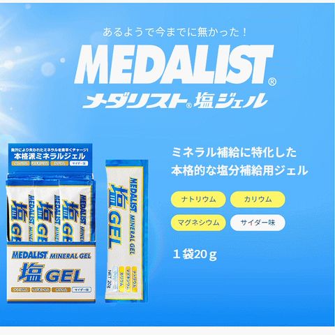 ■商品説明 「メダリスト塩ジェル」は、汗で失うミネラルを、体内の電解質バランスを考えて配合した、食べやすいサイダー味のゼリーです。