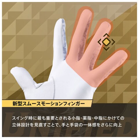 スイング時に最も重要とされる小指・薬指・中指の可動をスムーズにするため、指マチから手の平にかけて立体的な設計を施すことで、さらなる素手感覚を実現しました。手の平側のシワをも軽減させることで、手と手袋の一体感を高めます。