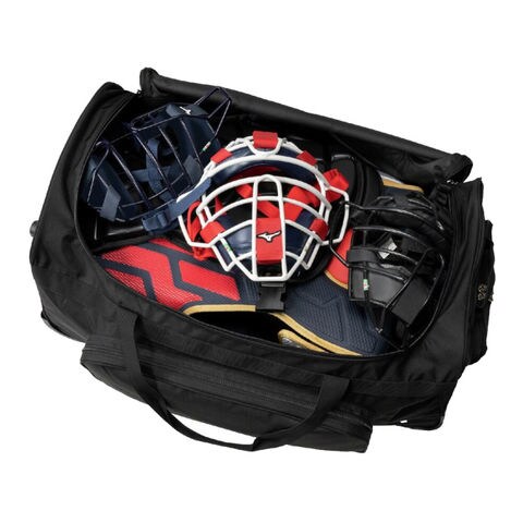 捕手防具3セットまたは両耳ヘルメット8個収納可能。内側メッシュポケット付き。