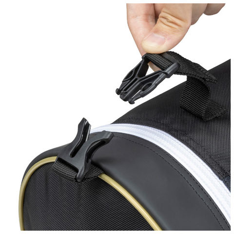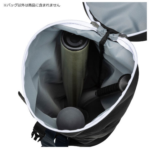 10本のバット収納に加え、開口部のファスナーを閉めずに仮止めできるバックル搭載。