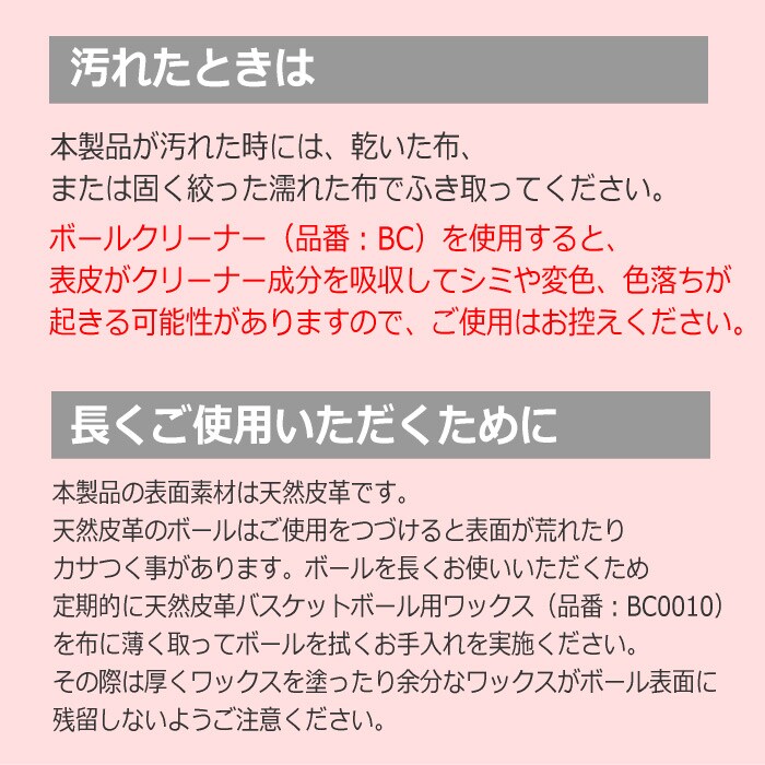 ボールクリーナー(品番:BC)を使用すると、表皮がクリーナー成分を吸収してシミや変色、色落ちが起きる可能性がありますので、ご使用はお控えください。