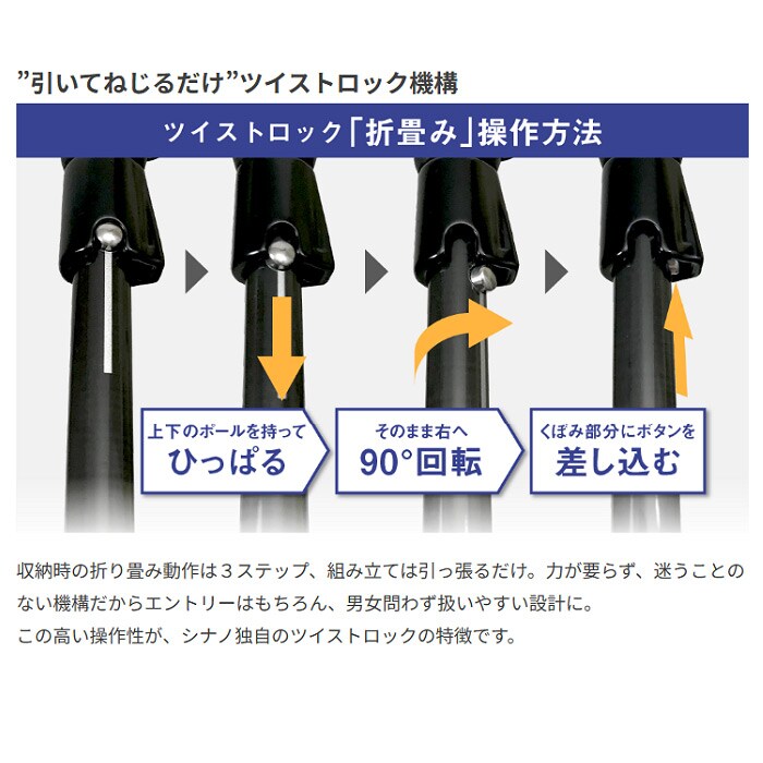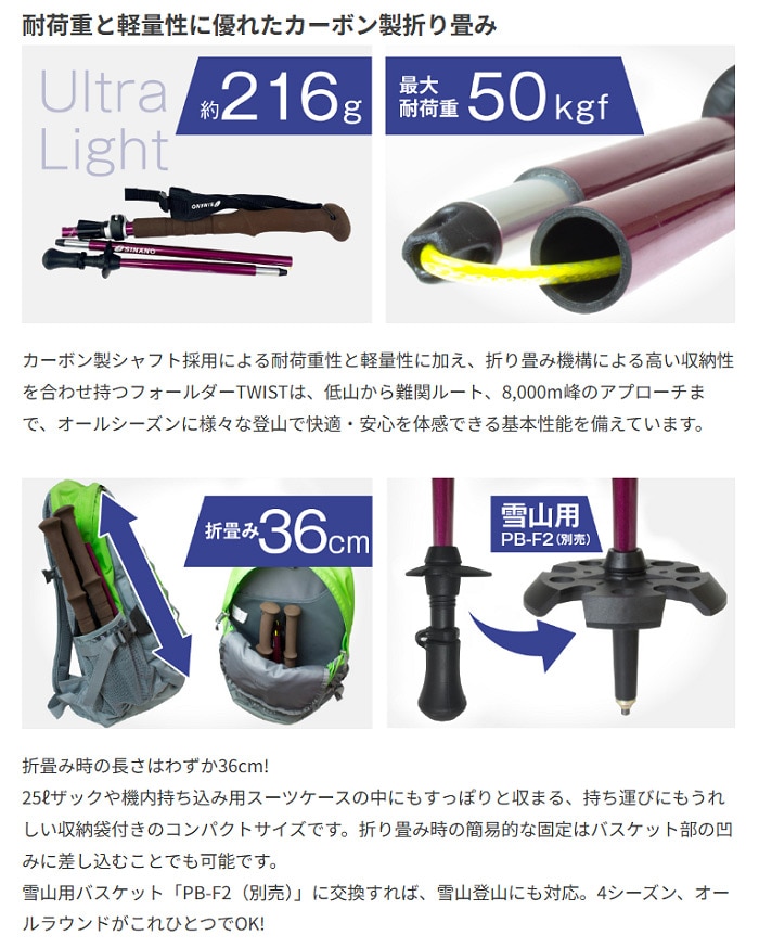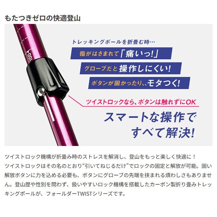 シナノ トレッキングポール フラッグシップモデル。"引いてねじるだけ" ツイストロック機構が折畳み時のストレスを解消し、登山をもっと楽しく快適に!