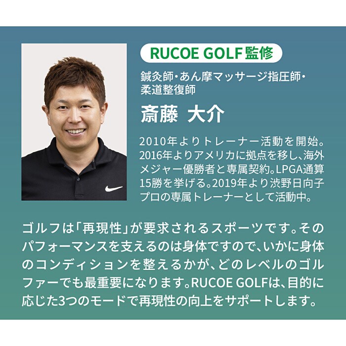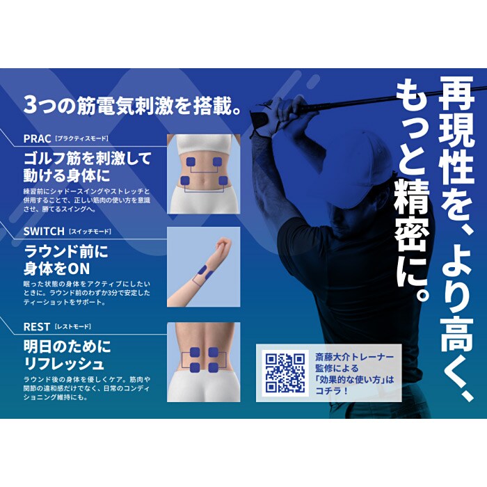 理想のプレーを追求するプロ・アマすべてのゴルファーのための、これまでにないコンセプトの筋電気刺激機器です。