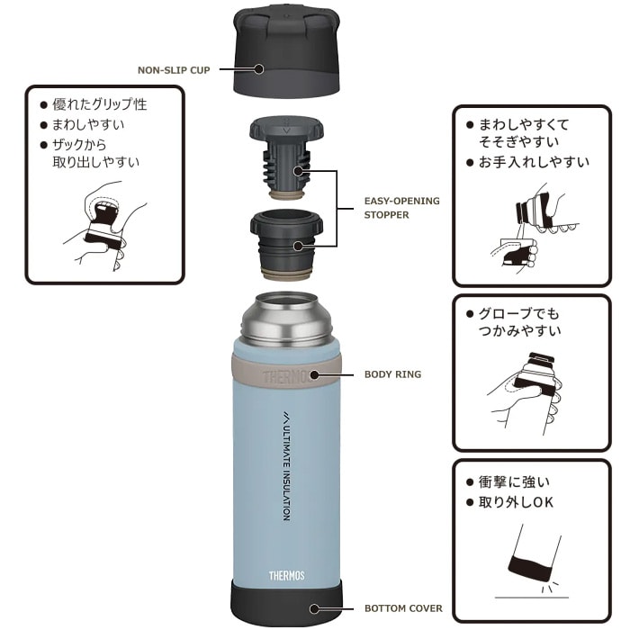 厳しい条件を想定して開発されたサーモスのステンレスボトルです。