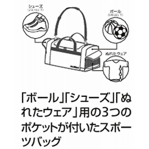 「ボール」「シューズ」「ぬれたウェア」用の3つのポケットが付いたスポーツバッグ。