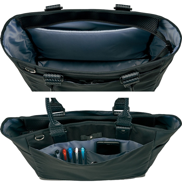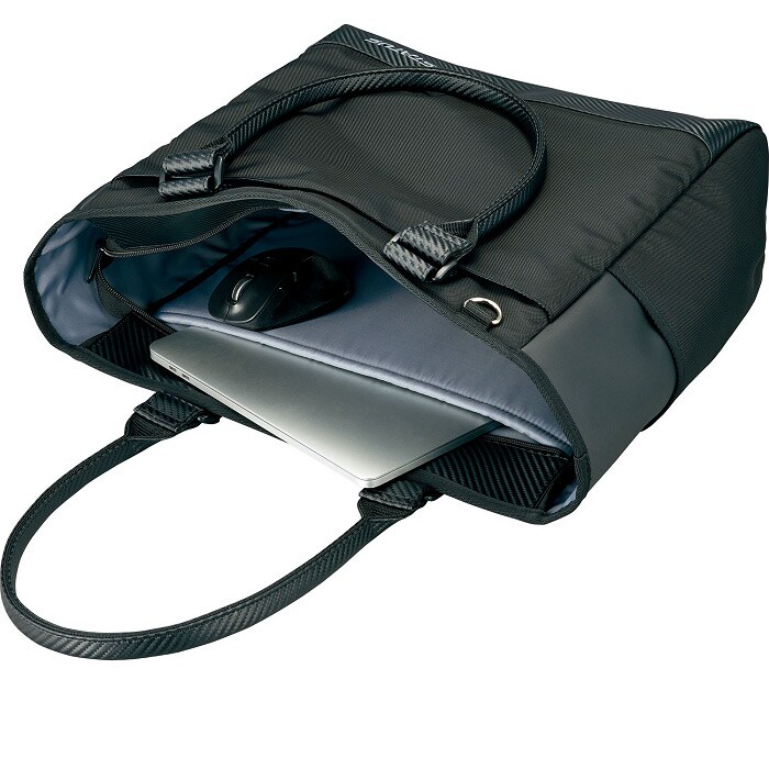 PCオーガナイザーや小物ポケットなど、使い勝手の良いトートバッグ。