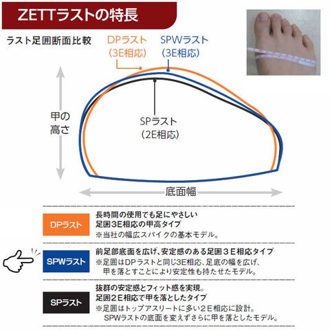 ※DPラスト(ZETT幅広スパイク基本モデル) に比べ、足底の幅を広げ、甲を落とすことにより安定性を持たせたモデル。