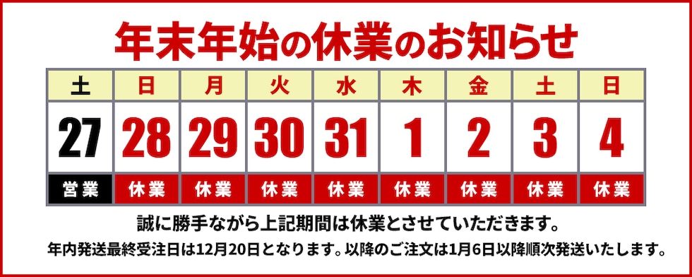 - 年内発送の受注は締め切っております。21日以降のご注文は1月6日以降順次発送いたします。