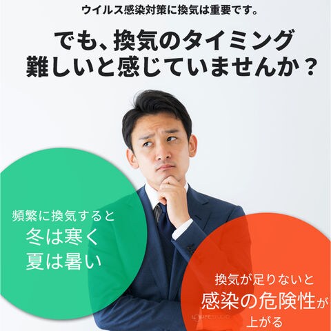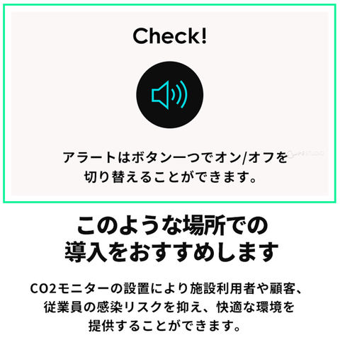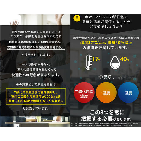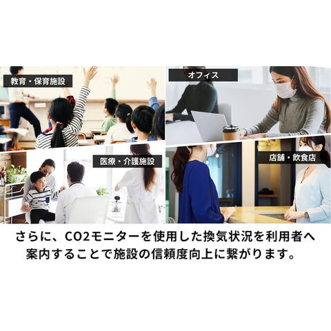 ウイルス対策に必要な換気ですが、頻繁に換気すると室内の温湿環境が不安定になり快適性が懸念されます。CO2モニターは室内の二酸化炭素濃度、温度と湿度の3つをモニタに表示。換気のタイミングを見える化します。