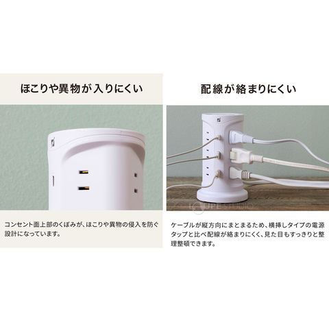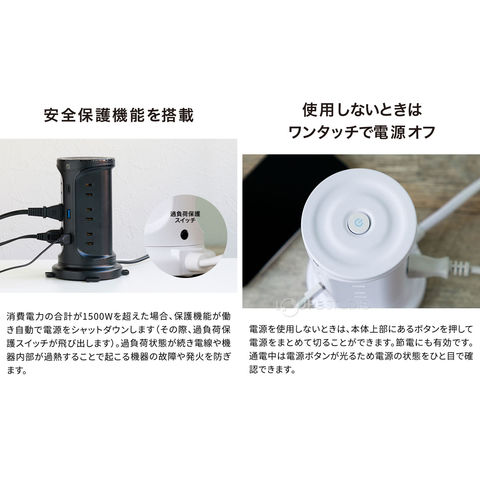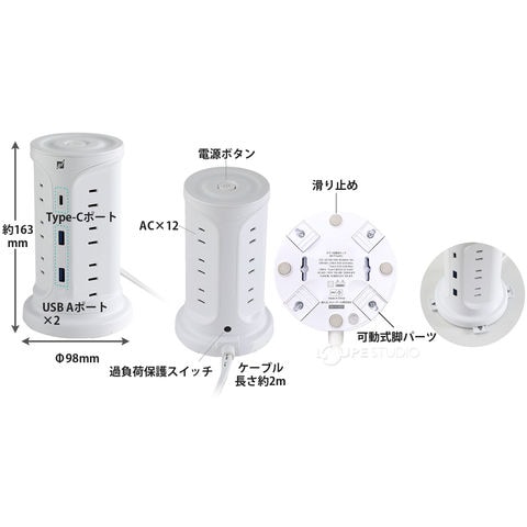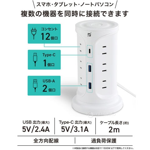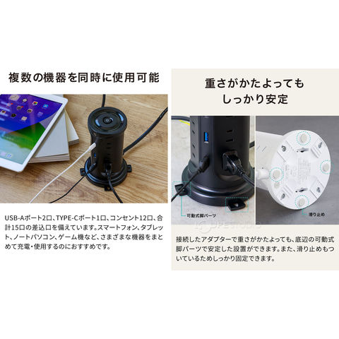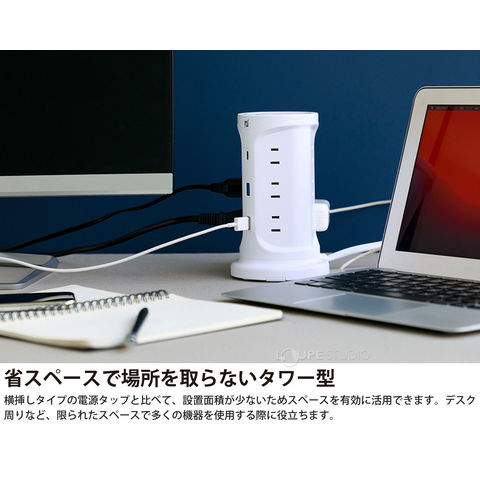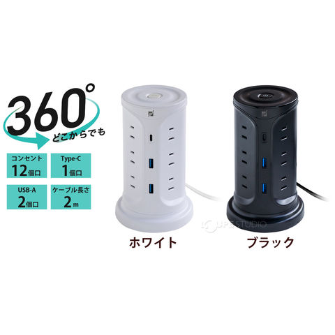 電源タップ USB type-c コンセント タワー型 パソコン スマホ タブレット ゲーム機 充電 デスク 黒 白 仕事 勉強 オフィス 事務用品 省スペース タワタップ 12口スペック