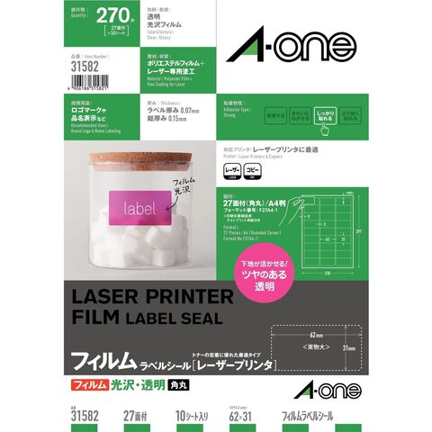 エーワン ラベルシール レーザープリンタ 光沢フィルム・透明 A4 27面 10シート入 31582