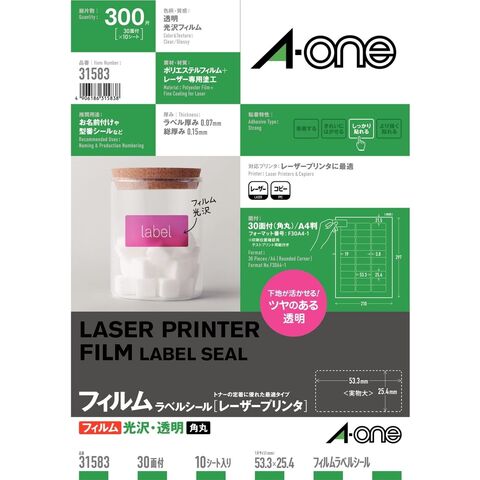 エーワン レーザープリンタラベル 透明光沢 31583|A4 30面 10シート