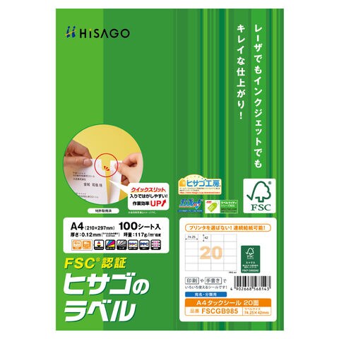 ヒサゴ タックシール A4 20面 100シート FSCGB985|環境 配慮 上質紙