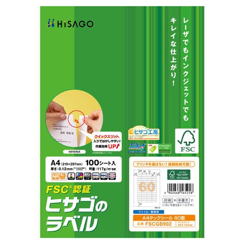 ヒサゴ タックシール FSC森林認証紙 FSCGB902|A4 60面 100シート