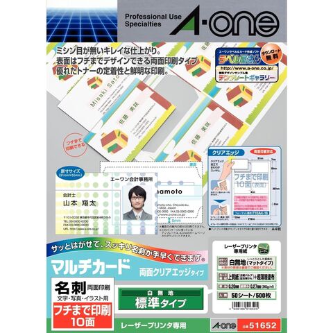 マルチカード フチまで印刷10面(クリアエッジタイプ) レーザープリンタ専用(両面印刷) エーワン 51652