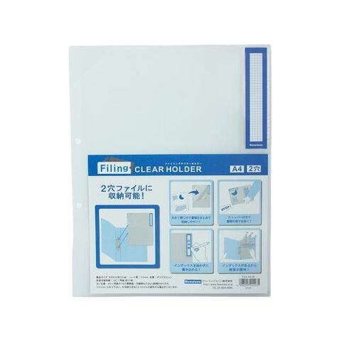 | 商品仕様 | ●2穴ファイルにそのまま収納可能。●大きく開くので書類をまとめて収納できます。●書類の落下を防ぐストッパー付き。●インデックスを抜かずに書き込み可能。 ●穴数:2穴●外寸:縦305×横233mm●シート厚:0.2mm●材質:本体=再生PP,インデックス=紙●インデックス付 |