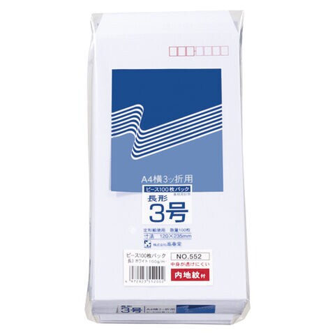 | 商品仕様 | ●規格:長3/〒枠付●サイズ:縦235×横120mm●紙厚:100g/m2●材質:ケント紙●仕様:サイド貼り |