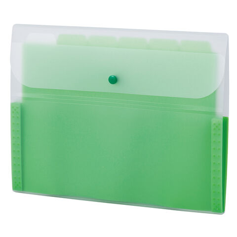| 商品仕様 | 分類整理に便利な薄型ケース。書類をわかりやすくスッキリ分類。 分類整理に便利な薄型ケース。書類をわかりやすくスッキリ分類。 A4サイズの書類を5仕切6ポケットで分類整理。 間口が大きく開くから書類が取り出しやすく、書類を入れたまま検索できます。 クリヤーフォルダーが入るワイドなサイズ。 商品サイズ:縦251×横325×背幅10mm カラー:グリーン 本体材質:PP 0.4mm厚 ホック材質:POM |