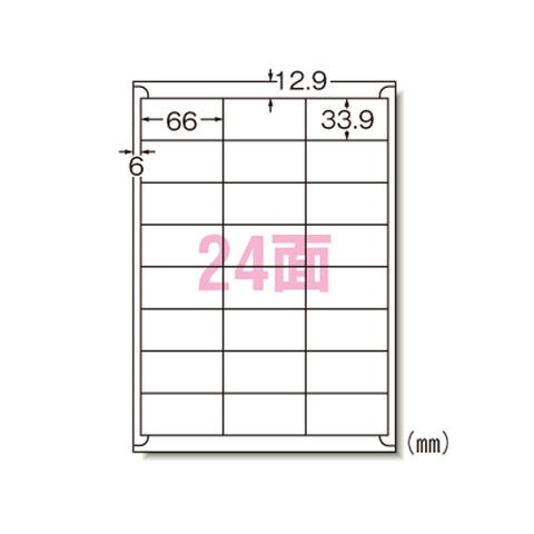 | 商品仕様 | ●用途に合わせてサイズが選べる、マット紙ラベルシリーズ。 ●規格:A4判24面●1片寸法:縦33.9×横66mm●紙種:上質紙,レーザー専用塗工●総紙厚:0.13mm |