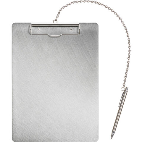 | 商品仕様 | ●水で洗えて衛生的なオールステンレスボディ(SUS430)。●ペンの落下を防止するチェーンとステンレスペン付き。 ●規格:A4判タテ型●外寸:縦330×横240mm●厚:14mm●ボード厚:0.6mm●綴じ枚数:50枚●材質:ステンレス●チェーン,ペン(0.7mm油性ボールペン)付 |