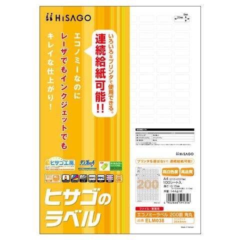 ヒサゴ エコノミーラベル 200面 角丸 A4 100シート ELM038