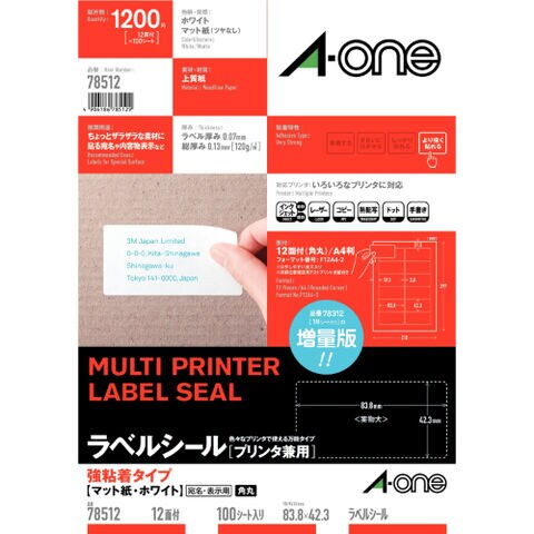 | 商品仕様 | ●用途に応じて選べる5タイプ。●段ボールなど剥がれやすいものにもしっかり貼れて剥がれにくいので安心です。 ●規格:A4判12面 角丸●1片寸法:縦42.3×横83.8mm●紙種:上質紙●総紙厚:0.13mm |